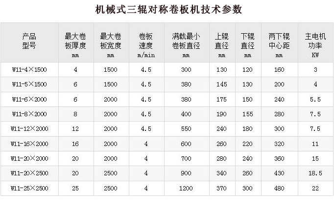 本機結構型式為三輥對稱式,上輥在兩下輥中央對稱位置作垂直升降運動,通過絲杠絲母蝸輪蝸桿傳動而獲得;兩下輥作旋轉運動,通過減速機輸出齒輪與下輥齒輪相嚙合,為卷制板材提供扭矩。本機床結構緊湊,操作維修方便。